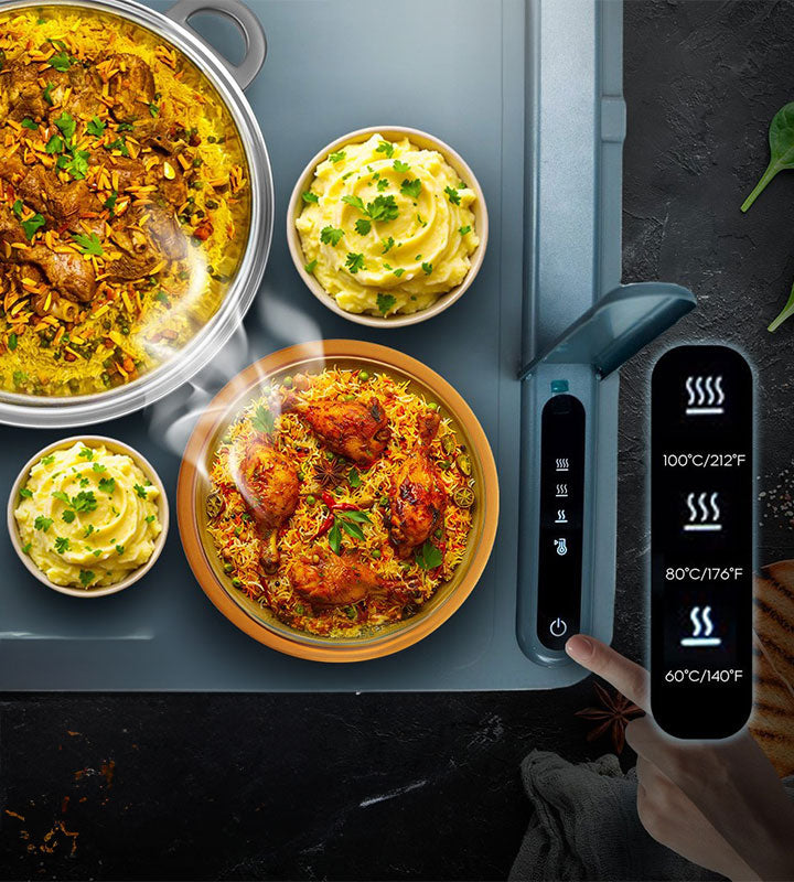 بمجرد تشغيله، يحافظ سخان الطعام على درجة حرارة ثابتة على السطح بالكامل دون ظهور بقع باردة. ويمكنه الحفاظ على الطعام دافئًا لمدة تصل إلى 3 ساعات متواصلة قبل التبديل تلقائيًا إلى وضع السكون.